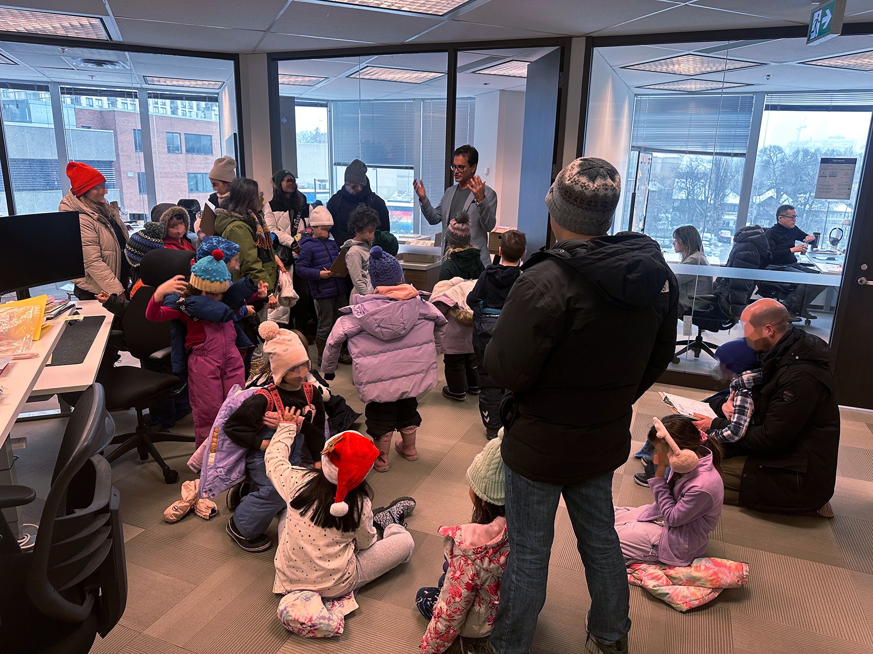 On December 15, SkyLaw was visited by 39 students from Brown Public School to learn about commerce. Kevin’s kids helped to plan this special visit, which took place during their field trip. It was a pleasure answering their questions and hearing their delightful comments, such as, “Do you sleep here?” and “Why is there so much junk food? I thought there would only be healthy food because this is an office.”